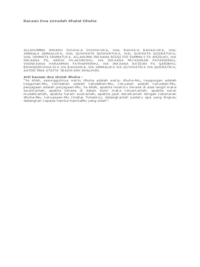 Bacaan doa setelah sholat dhuha dalam format pdf ini dapat dijadikan referensi bagi anda yang ingin mengerjakan ibadah sholat sunnah dhuha. Jumlah rakaat sholat dhuha minimal 2 rakaat. Jamaala jamaaluka, wal quwwata quwwatuka, wal qudrata qudratuka, Tata cara sholat dhuha a. 1/31/2017 bacaan doa setelah shalat dhuha | teori pendidikan home contoh makalah makalah pendidikan contoh skripsi karya ilmiah contoh surat doa selamat . Doa setelah sholat dhuha dan artinya. Doa shalat istikharah saat sholat atau sesudah. Doa yang dibaca ketika dhuha. Biasanya sholat ini dilaksanakan setelah fajar hingga sebelum masuk waktu dzuhur. Shalat dhuha merupakan shalat sunnah yang dilakukan ketika pagi hari.